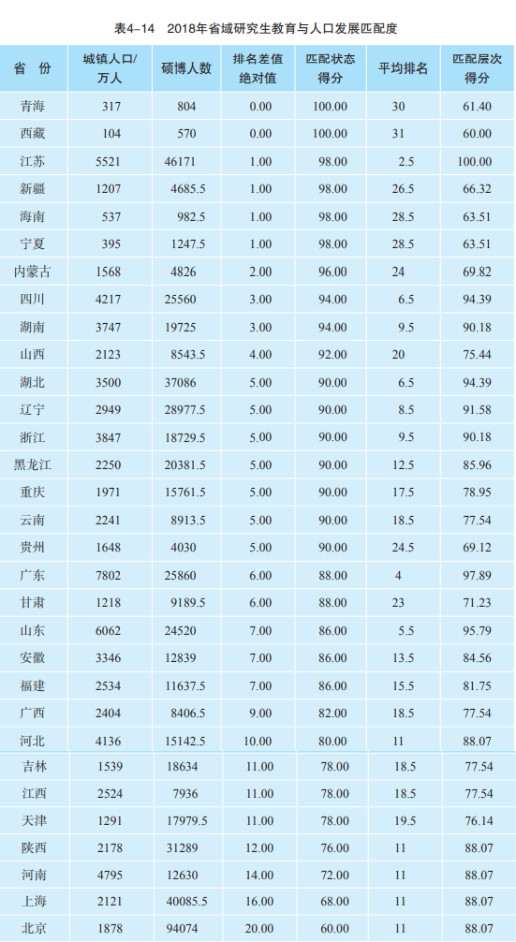 研究生教育与人口发展高度匹配的地区包括青海、西藏、江苏、新疆、四川、湖南等10个省份。其中,江苏省、四川省及湖南省属于高层次高度匹配状态,其余省份属于中低层次的高度匹配。