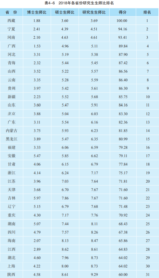 2018年,西藏自治区、宁夏回族自治区以及河南省分别位于全国31个省份研究生生师比的前三名。