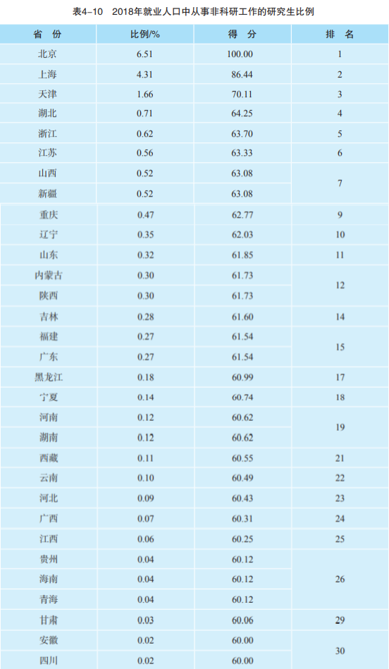 北京市、上海市和天津市是从事非科研工作的研究生比例最高的3个直辖市,分别为 6.51%、4.31%和1.66%。