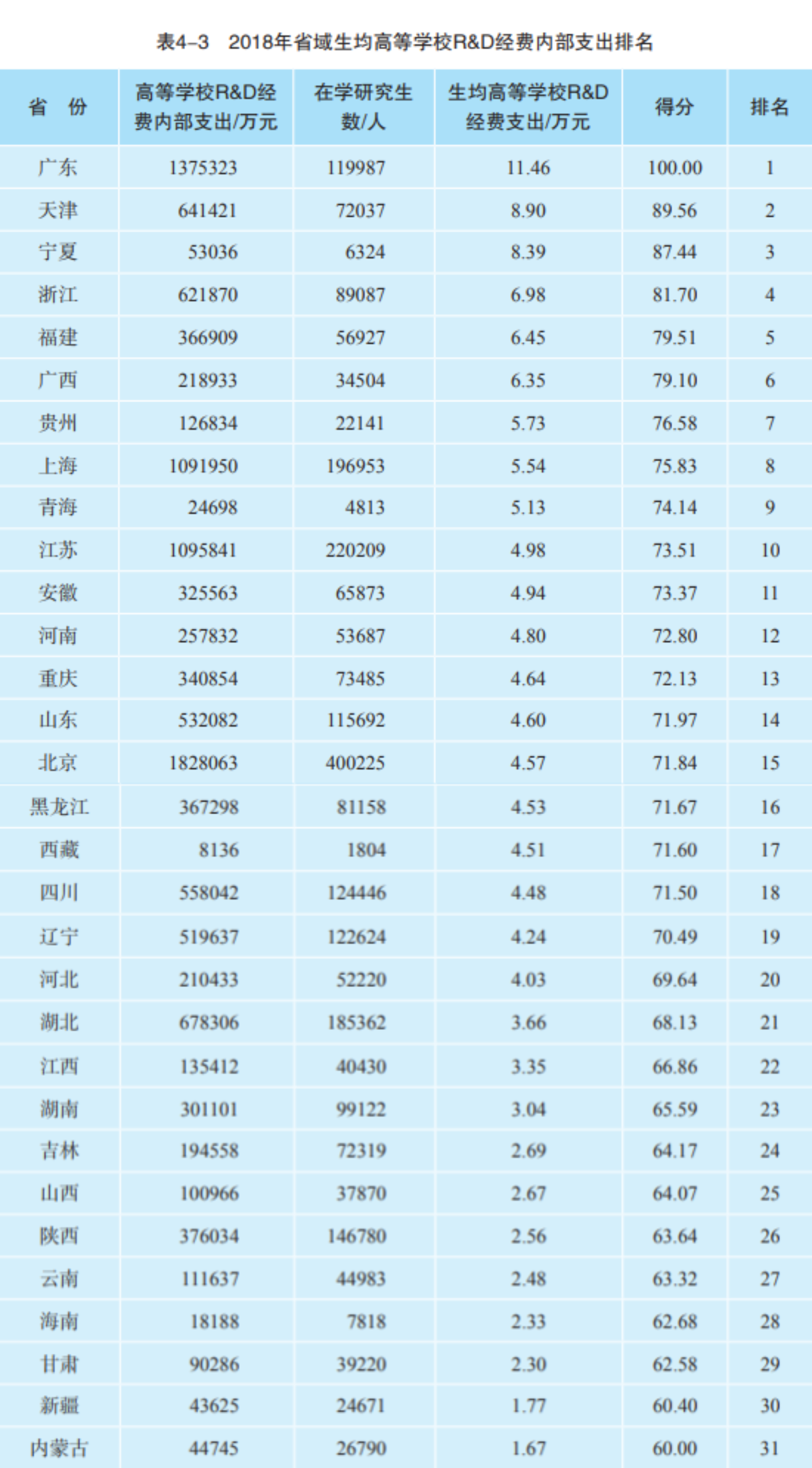 从生均高等学校R&D经费来看,广东省以11.46万元遥遥领先于第二名天津市的8.90万元和第三名宁夏回族自治区的8.39万元。