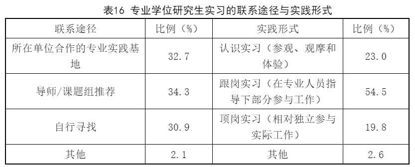 (3)在联系专业实习/实践单位的途径方面,34.3%的专业学位研究生通过导师或课题组推荐,32.7%学生的实习地点是与所在单位合作的专业实践基地,30.9%的学生通过个体寻找的方式参与专业实践活动。就实践形式而言,超过半数(54.5%)的专业学位研究生采取跟岗实习(在专业人员指导下部分参与工作)的方式参与专业实践,23.0%的学生通过认识实习(参观、观摩和体验)的方式参与专业实践,19.8%的学生以顶岗实习(相对独立参与实际工作)的方式参与专业实践(见表16)。