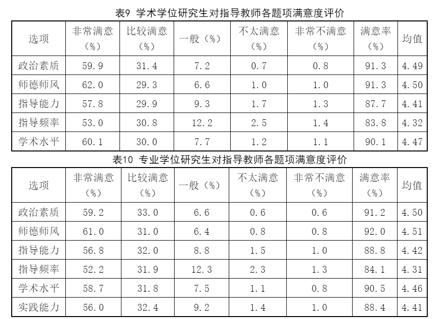 (1)学术学位研究生对导师政治素质、师德师风和学术水平的评价相对较高(满意率分别为91.3%、91.3%、90.1%);对导师的指导能力也较为认可,满意率达到87.7%;对导师指导频率的评价相对较低,满意率为83.8%(见表9)。