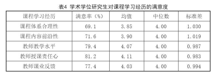 研究生对课程教学的满意率为76.9%,比总体满意率高3.3个百分点(见表3)。