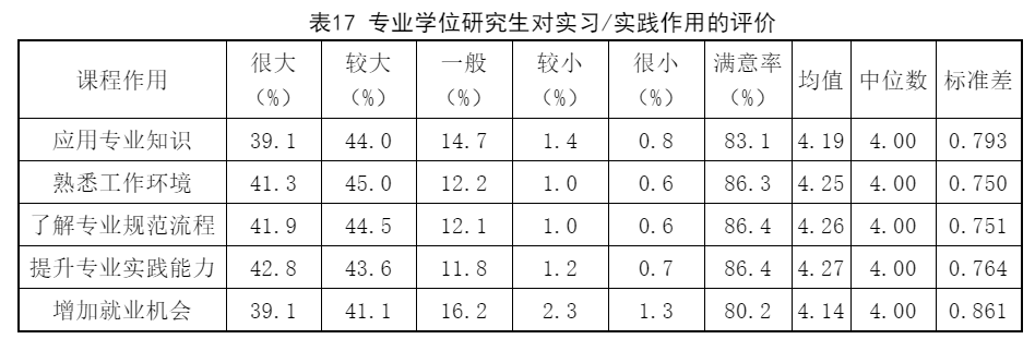 对于评价实习/实践的作用,专业学位研究生认为专业实践活动在多个方面促进了自身发展。具体而言,学术型研究生对于专业实践作用的满意率从高到低依次为了解专业规范流程(86.4%)、提升专业实践能力(86.4%)、熟悉工作环境(86.3%)、应用专业知识(83.1%)和增加就业机会(80.2%)(见表17)。