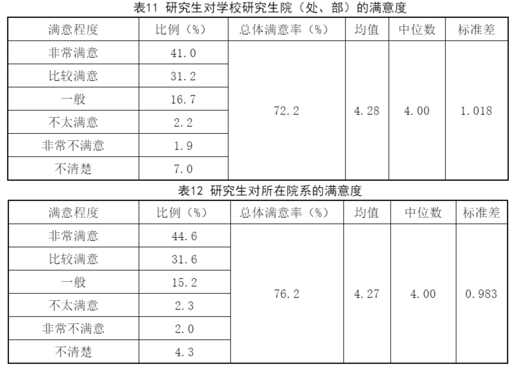 研究生对院系管理与服务的满意度高于对研究生院(处、部)的满意度对培养单位的研究生院(处、部)管理与服务的满意率为72.3%(见表11),对所在院系管理与服务的满意率为76.2%(见表12)。
