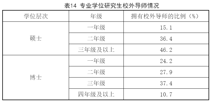 (1)与2021年相比,拥有校外导师的专业学位研究生的比例增加了4.9个百分点,但总体而言仍然偏低,仅有27.7%的专业学位研究生拥有校外导师。专业学位博士生拥有校外导师的比例(26.2%)略低于专业学位硕士生(27.7%)。专业学位研究生拥有校外导师的比例各年级存在差异,三年级硕士生拥有校外导师的比例最高,为46.2%;四年级博士生拥有校外导师的比例最低,仅为10.7%(见表14)。在拥有校外导师的专业学位研究生中,有86.1%的研究生对校外导师的指导表示满意。