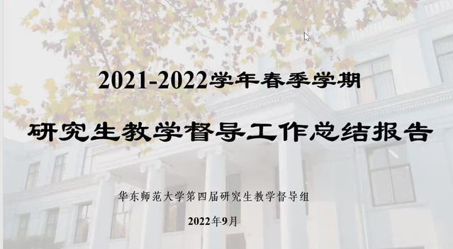 为做好研究生课程教学质量管理督导工作,2022年9月21日上午,2022-2023学年秋季学期华东师范大学研究生教学督导工作启动暨研讨会在线上召开。主要参会人员有学校研究生教学督导组专家、研究生培养办公室相关工作人员及研究生督导联络员。会议由研究生培养办公室副主任于浩教授主持。